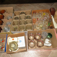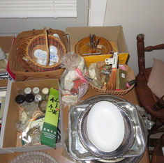 Steinway & Son upright piano, mason jars, cedar chest, small tables, rugs, fabric, yarn, Tupperware, corning ware, small tables and more.